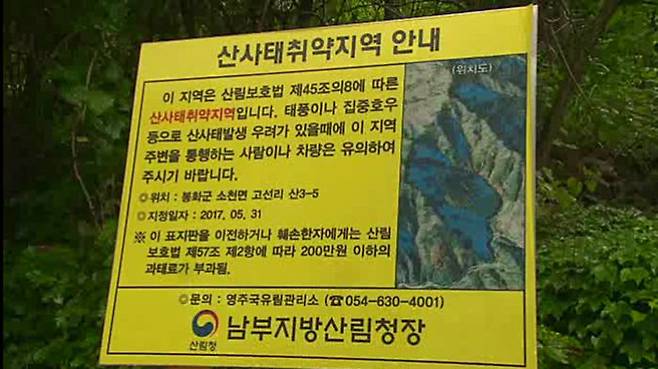 환경 파괴 말고도 우려되는 부분이 하나 더 있습니다. 재난 위험이 커질 수 있다는 점입니다. 먼저 산사태 발생 가능성이 제기됩니다. 송전탑을 설치하려면 일대 산림을 깎아내야 합니다. 관련 자재를 옮기기 위해 장비가 지나갈 길도 새로 만들어야 합니다. 한국전력은 산림 훼손 최소화를 위해 헬기를 적극 활용하겠다고 했습니다. 하지만 적어도 송전탑 설치 지역에 대한 불가피한 훼손을 부정할 수는 없습니다. 서울대 산림과학부 임상준 교수는 자연사면이 송전탑 설치로 형질이 변경됐기 때문에 폭우가 발생하면 물이 한쪽으로 모여서 산사태 발생 가능성이 높아질 수 있다고 말합니다. 특히 경북 봉화군 춘양면과 소천면 일대는 산사태 취약지역으로 분류돼 있습니다. 지난 2008년에 일대 집중 호우로 산사태가 발생해 4명이 숨지는 사고도 있었습니다.