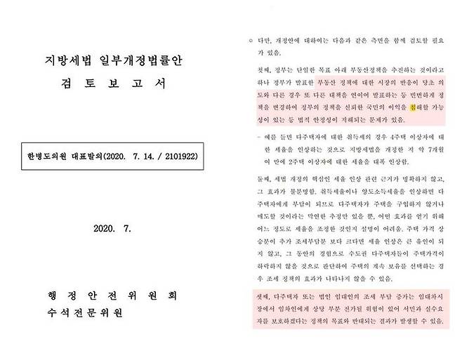 "정부가 빈번하게 정책을 변경하여 정부의 정책을 신뢰한 국민의 이익을 침해할 가능성이 있는 등 법적 안정성 저해"될 수 있고, "서민과 실수요자를 보호하겠다는 정책의 목표와 반대되는 결과가 발생할 수 있다"는 내용이 지방세법 개정안 검토보고서에 담겼고요.
