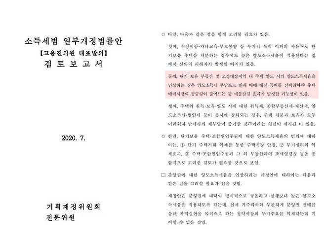 "주택 시장에서 매물 잠김 효과가 발생할 가능성이 있다"는 내용도 소득세법 개정안 검토보고서에 있었습니다.