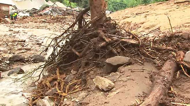갑작스럽게 쓸려 내려온 흙더미에 건물은 형체도 알아볼 수 없게 사라졌고, 주변에는 기둥째 뽑힌 나무들이 나뒹굴고 있습니다.