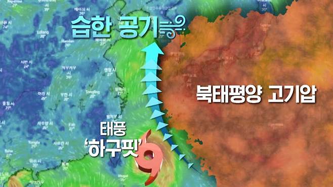 이번 장마전선은 북태평양 고기압의 가장자리를 따라 습한 공기를 계속 공급받으며 발달했는데, 반시계 방향으로 도는 태풍 하구핏까지 습한 공기를 밀어 넣고 있는 것입니다.