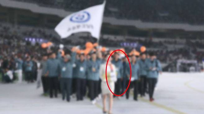 2019년 전국체육대회 개막식. 한 남성이 다른 선수들과 함께 환하게 웃으며 입장합니다.
