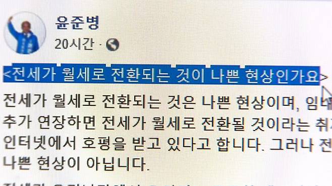 윤준병 의원은 소셜미디어에 글을 올려 "전세가 월세로 전환되는 것이 나쁜 현상"이냐고 반문했습니다.
