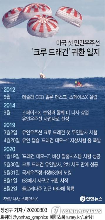 ![지구 귀환 비행에 나선 첫 민간 유인우주선 '크루 드래건' [AP=연합뉴스, NASA 제공·재판매 및 DB 금지]](https://img4.daumcdn.net/thumb/R658x0.q70/?fname=https://t1.daumcdn.net/news/202008/03/yonhap/20200803080422826mbhm.jpg)