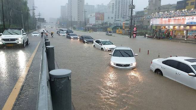 3일 충남 천안시 서북구 한 대형마트 앞 도로에 물이 가득 들어차 주민 발이 묶여 있다. 급격히 불어난 물로 차량도 줄줄이 침수 피해를 봤다.