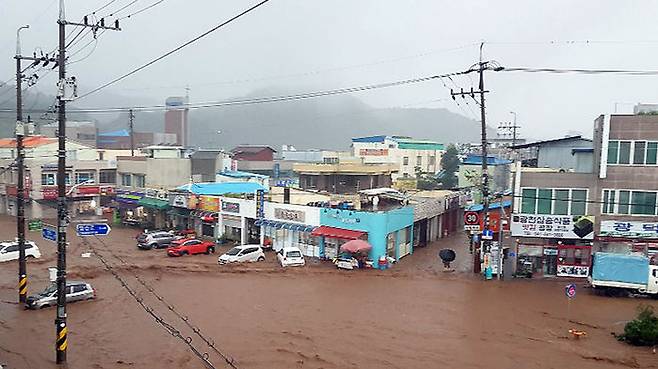3일 내린 폭우로 충남 예산군 예산읍내 전통시장이 물에 잠겼다.