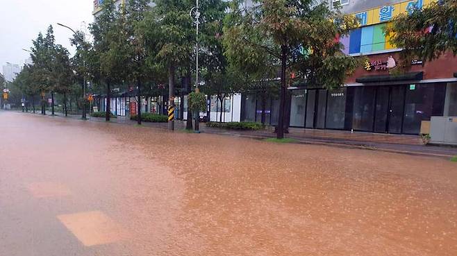 시간당 40㎜ 넘는 폭우가 쏟아진 3일 충남 천안시 서북구 한 아파트 단지 인근 도로에 물이 가득 들어차 있다.