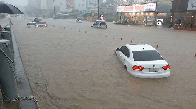 3일 오후 충남 천안시 신방동 홈플러스 앞 도로에 물이 들어차 차량이 반쯤 잠겨 있다.