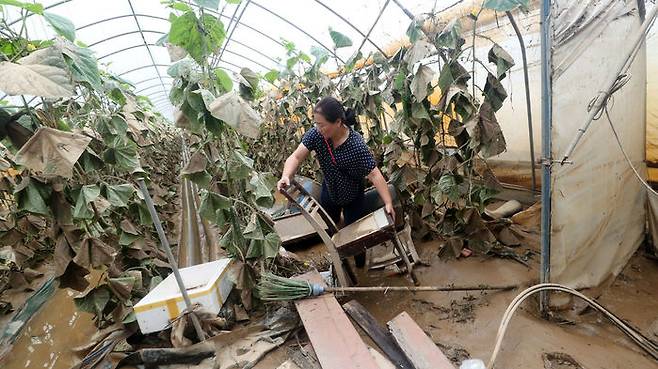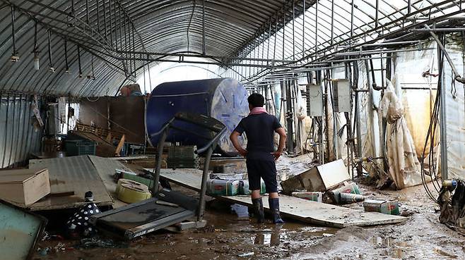 4일 오전 충남 천안시 수신면 장산리 한 하우스 농가에서 주인이 수해 피해 상황을 확인하고 있다.