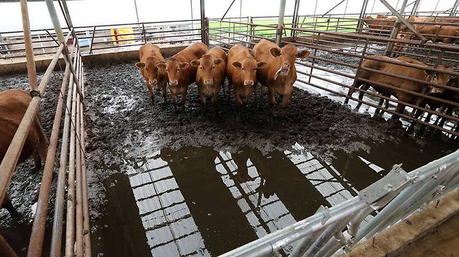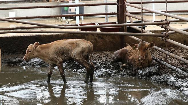 4일 오전 충남 천안시 수신면 장산리 한 축사에 물이 잔뜩 고여 있다.