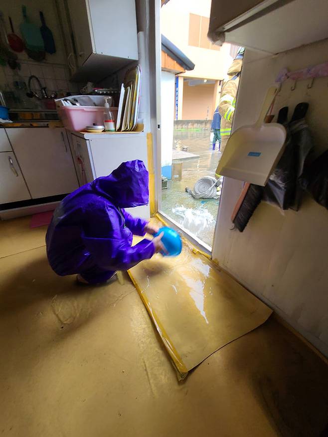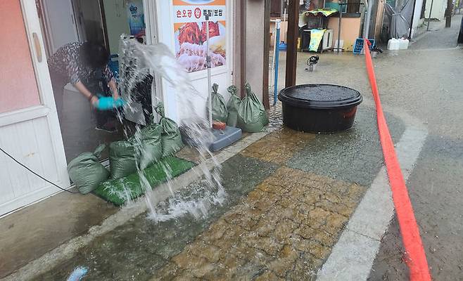 4일 오후 시간당 20∼30㎜의 비가 쏟아진 강원 속초지역 곳곳에서 침수피해가 발생한 청호동 저지대에서 집안으로 들어온 빗물을 주민이 퍼내고 있다.