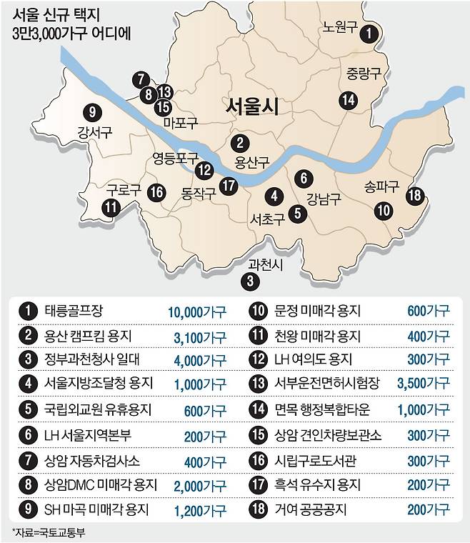 신규 택지 중 가장 큰 규모는 노원구 공릉동에 있는 태릉골프장(1만가구)이다. 1966년 개장한 군 전용 골프장인 태릉골프장은 정부가 몇 년 전부터 국방부와 택지 공급을 위해 협의했으나 뜻을 이루지 못하다 이번에 전격적으로 택지 개발이 확정됐다.