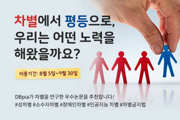 디비피아는 또한 논문읽기 캠페인을 위한 지식누림 코너에서 ‘차별’을 주제로 하는 우수한 국내논문 18편을 추려 8월 5일부터 9월 30일까지 원문전문을 공개한다고 밝혔다. 논문은 △성별, 장애, 소수자, 고용 등의 차별의 형태와 양상 △차별금지법과 유엔협약 등 차별철폐를 위한 인류의 노력 △표현의 자유와 온라인 혐오표현 규제와 같은 차별을 둘러싼 이슈 등을 다루고 있으며, 디비피아 홈페이지 회원으로 가입하면 누구나 자유롭게 논문을 다운로드 할 수 있다.