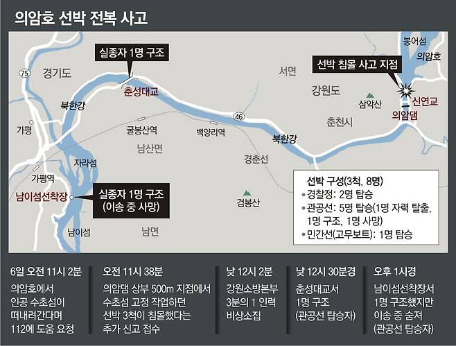 전복 직후 관공선에 타고 있던 A 씨(60)는 자력으로 탈출해 육지에 올라왔다. 하지만 나머지 7명은 급류에 휩쓸려 사라졌다. 배 3척과 실종자 모두 폭 13m의 의암댐 6번 수문을 통해 하류로 떠내려간 것으로 알려졌다. 의암댐은 최근 계속된 집중호우로 수위가 높아져 2일부터 수문을 열고 방류 중이었다.