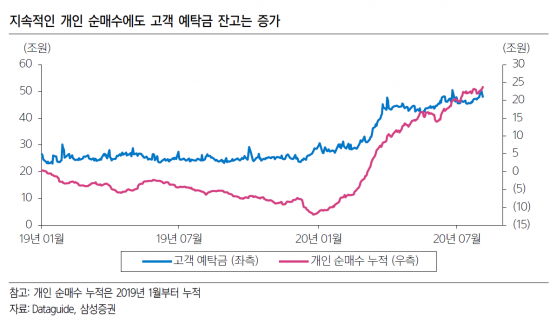 8일 한국거래소에 따르면 코스피와 코스닥시장을 통틀어 지난 7일까지 개인 투자자들의 올해 순매수 총액은 45조8327억원으로 집계됐다. 이와 동시에 개인 투자자의 주식계좌 현금으로 볼 수 있는 고객 예탁금 잔고는 지난해 말 27조3933억원에서 지난 6일 기준 48조8749억원으로 늘었다. 신용·미수 증감과 매도 결제분을 제외한 실질 고객 예탁금도 올해에만 14조원 가량 늘어난 것으로 추산된다. 역대급 매수세 못지 않게 신규자금 유입도 꾸준히 이어지고 있는 셈이다.