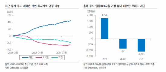 실제 올해 코스피 지수를 견인한 배터리, 바이오, 인터넷, 게임 등 'BBIG' 대표 7개 종목(LG화학, NAVER, 삼성바이오로직스, 셀트리온, 삼성SDI, 카카오, 엔씨소프트) 개인 순매수는 1조7000억원 수준이다. 외국인 8000억원, 기관 1조1000억원을 웃도는 수준이다. 증시 주도주의 주체가 개인 투자자라는 분석이 나오는 이유다.