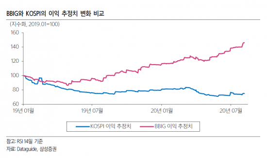 주변주도 역시 수혜를 입을 수 있다는 분석이다. 주도주의 가격에 부담을 느끼는 투자자도 존재하기 때문이다. 서 연구원은 "BBIG 업종 내 그간 상승이 더뎠던 후순위 종목에 관심을 기울일 필요가 있다"며 "더불어 소외 업종에서도 실적 모멘텀이 확인되는 종목이라면 경기 회복 이슈가 불거지는 시점에서 알맞은 대안이 될 것"이라고 전망했다.