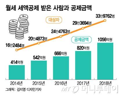 월세 세액공제를 받은 사람은 2018년 기준 총 33만9762명, 공제 금액은 1056억원이었다. 1인당 평균 31만원 가량이다. 다달이 내는 한달 월세에도 미치지 못한다. 이마저도 2014년엔 16만2484명, 414억원에 불과했다. 4년 사이 공제받은 사람이 2배 늘어난 것은 월세 전환의 가속화와 무관치 않아 보인다.