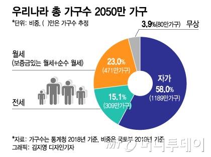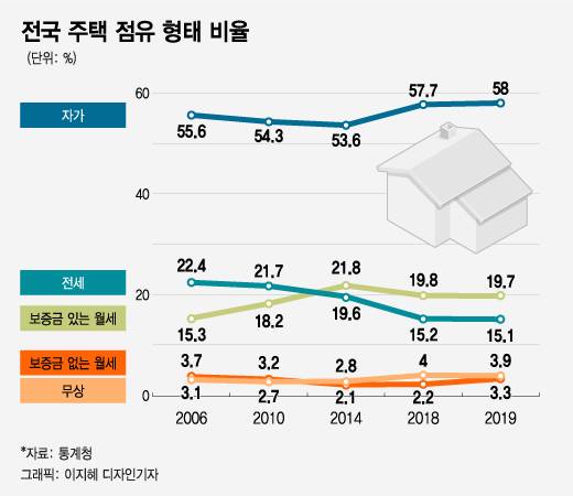 국토교통부의 2019년도 주거실태조사에 따르면 우리나라 전체 가구의 41%가 '내집'이 아닌 '임차가구'였다. 임차가구는 △전세 △보증금이 있는 월세 △보증금이 없는 월세 △무상 등으로 세분화된다. 통계청이 2015년 실시한 인구주택총조사 결과가 가장 최신 자료인데 임차가구 중 전세와 월세(보증금 있는 월세 포함)의 비중은 대략 4대6 수준으로 추정된다.