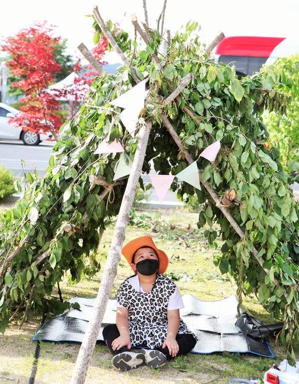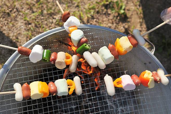 그 사이 인공연못이 있는 너른 잔디 마당에는 이미 적당하게 자른 나뭇가지와 노끈들이 준비되어 있었다. 나만의 아지트를 만들기 위한 준비물들이다. 얼룩덜룩한 호피 무늬 튜닉까지 맞춰 입으니 원시인 가족이 됐다. 각자의 창의성이 담긴 아지트를 완성한 후에는 활비비로 붙을 피우라는 미션이 떨어졌다. 한참을 낑낑댔지만 결국 파이어스틸이 긴급 투입된 후에야 화로에 불이 올랐고, 달콤한 마시멜로 꼬치를 맛볼 수 있었다. 이렇게 땀 흘린 후의 밥맛은 꿀맛이 아닌가. 야외에서 먹는 바비큐는 신선하고 선선한 공기 때문인지, 평소보다 배로 맛있었다. 요즘 웃을 일이 별로 없었다던 참가자들은 저녁 레크리에이션 시간에 원 없이 웃을 수 있었다.