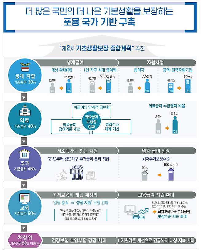 비수급빈곤층 해소, 수급자 보장수준 강화, 탈빈곤 지원 등 기초생활보장제도의 핵심 목표 이행을 위한 제2차 기초생활보장 종합계획의 주요 과제를 2023년까지 차질없이 준비·시행한다.