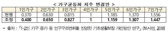 생활실태 대비 저평가되어 있는 1·2인 가구의 지수를 인상하는 등 가구균등화 지수를 변경한다.