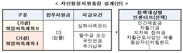 이를 통해 대상 요건 등을 단순화하고, 정부지원금 비율도 기존 소득비례 등 다양한 방식에서 1:3(본인적립금 : 정부지원금)으로 일원화한다.
