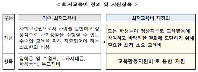 교육급여 활용도 제고와 보장 강화로 체감도를 높인다. 교육급여는 개개인의 다양한 수요를 고려해 항목 중심의 지원에서 벗어나 개별적으로 필요한 교육활동을 위해 자율적으로 지출할 수 있도록 ‘교육활동지원비’로 통합 지원한다.