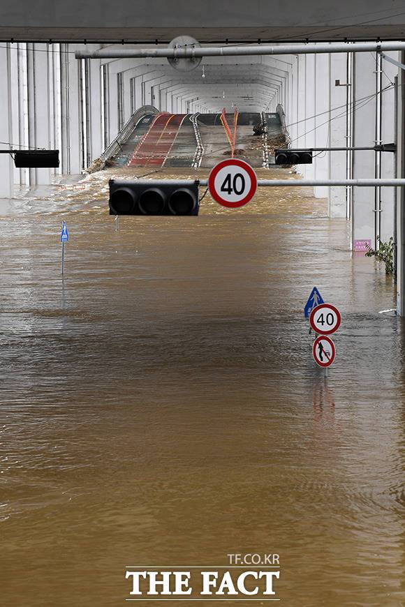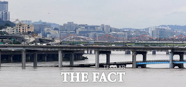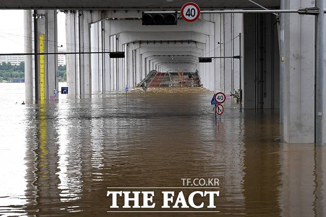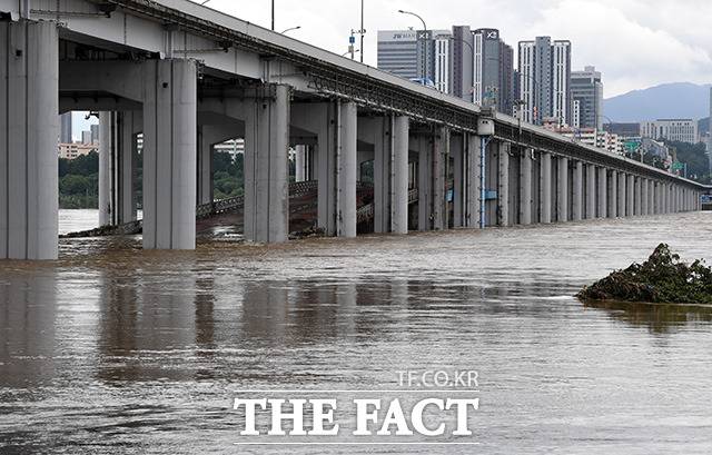 [더팩트ㅣ남용희 기자] 서울과 경기 등 한강 상류 지역에 연일 계속되는 집중호우와 팔당댐 방류로 인해 수위가 높아지고 교통 통제가 이어지고 있는 11일 오후 서울 동작대교에서 바라본 잠수교(아래)가 물에 잠겨 통행이 제한되고 있다.