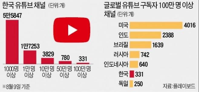 글로벌 전체로 보면 광고가 붙는 유튜브 채널 수에서 한국은 세계 8위 수준이다. 미국이 39만6513개로 1위였고 다음은 인도(27만8630개), 브라질(18만8746개), 인도네시아(14만1041개), 러시아(1만9214개) 등의 순이었다. 구독자 1억 명이 넘어 유튜브로부터 ‘레드 다이아몬드’ 버튼을 받은 유튜브 채널은 미국의 ‘퓨디파이’와 인도의 ‘티 시리즈(T-Series)’ 등 두 개다. 구독자 5000만 명 이상으로 ‘루비 버튼’을 받은 채널은 10개였다.