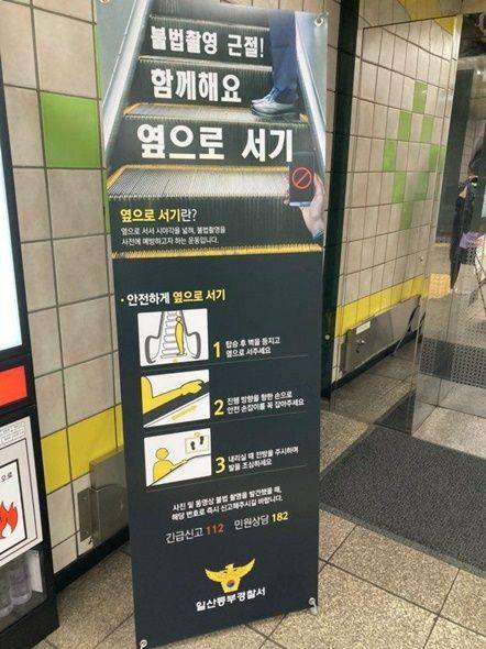 일산동부서가 지난 10일부터 독자적으로 도입한 이 캠페인은 에스컬레이트 이용 시에 탑승은 안전하게 정면으로 하고, 이동 중에는 시야 확보를 위해 옆으로 서 있자고 독려하고 있습니다. 에스컬레이트 뒤쪽에서 여성을 불법으로 몰래 촬영하는 범죄가 증가하자 예방 차원에서 마련한 대책입니다.