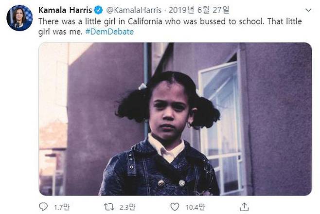 그는 과거 인종차별주의 성향 공화당 상원의원들과 협력했던 바이든 전 부통령의 이력을 겨냥, "당신은 그들과 버싱 반대에 협력했다. 당시 캘리포니아에 매일 버스를 타고 학교에 가던 소녀가 있었다. 그 작은 소녀가 나"라며 울먹였습니다.