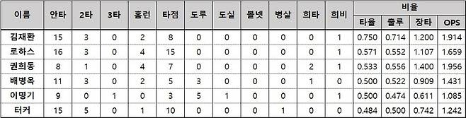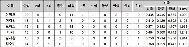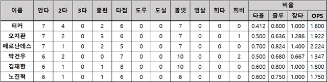 키움 서건창은 타점도 4타점이다. 이 밖에 최악의 팀 성적을 내고 있는 한화에서 고군분투하는 이용규(6안타 .316)가 인상적이다.