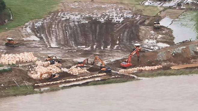 제방에서는 중장비가 투입돼 복구 공사가 한창입니다.