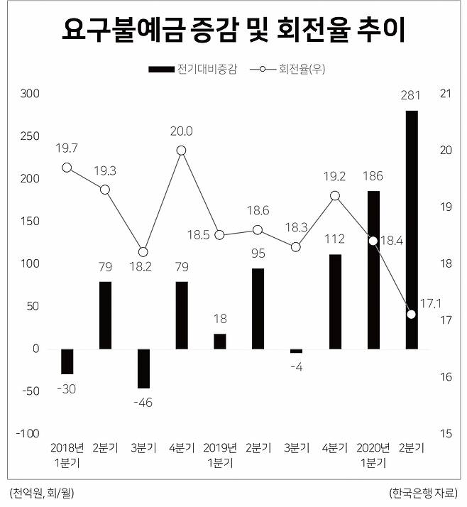 예금 규모의 가파른 증가 속도에 비해 출납은 원활하지 못해 이 예금의 회전율은 2분기 17.1(회/월)로 역대 최저를 기록했다. 예금회전율이란, 기업과 가계가 일정 기간 은행 계좌에서 돈을 인출한 정도를 보여주는 것으로 시중에서 돈이 얼마나 활발히 돌고 있는지는 보여준다. 인출 금액의 합을 계좌의 평균 잔액으로 나눠 산출한다.