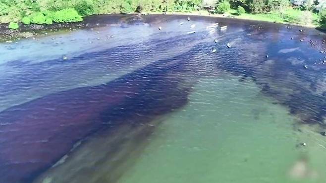 위성사진을 보면 사고 지점인 블루베이 해상공원에서 유출된 1천t의 기름은 북쪽으로 퍼져나가고 있음을 확인할 수 있습니다.