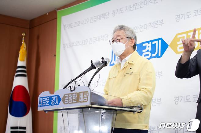 (서울=뉴스1) = 이재명 경기도지사가 14일 오후 경기도 수원시 경기도청 브리핑실에서 신종 코로나바이러스 감염증(코로나19) 집회 제한명령 관련 기자회견을 하고 있다.