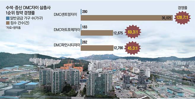 이어 DMC아트포레자이(수색7구역)가 일반분양 183가구 모집에 1만2675명이 몰려 평균 경쟁률 69.3대1을 기록했다. DMC파인시티자이(수색6구역)는 일반분양 282가구 모집에 1만2766명이 신청해 평균 경쟁률 45.3대1이 나왔다. 전날 접수한 신혼부부 특별공급 모집에도 3개 단지에 1만8000명이 몰렸다.