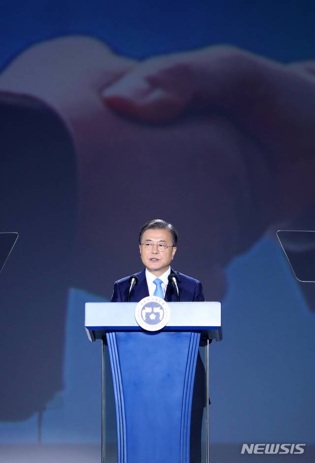 [서울=뉴시스]배훈식 기자 = 문재인 대통령이 15일 서울 중구 동대문디자인플라자에서 열린 제75주년 광복절 경축식에 참석해 경축사를 하고 있다. 2020.08.15.