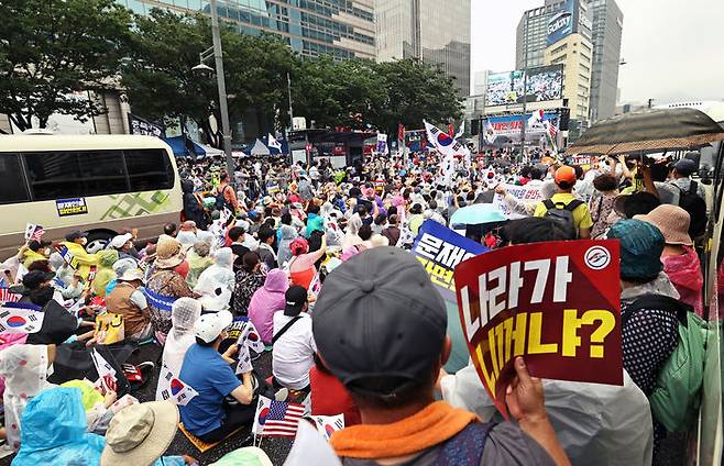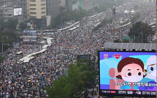 15일 오후 서울 종로구 동화면세점 앞에서 사랑제일교회와 대한민국바로세우기 국민운동본부 등 주최로 열린 정부와 여당 규탄 집회 참가자들이 세종대로를 가득 메우고 있다.