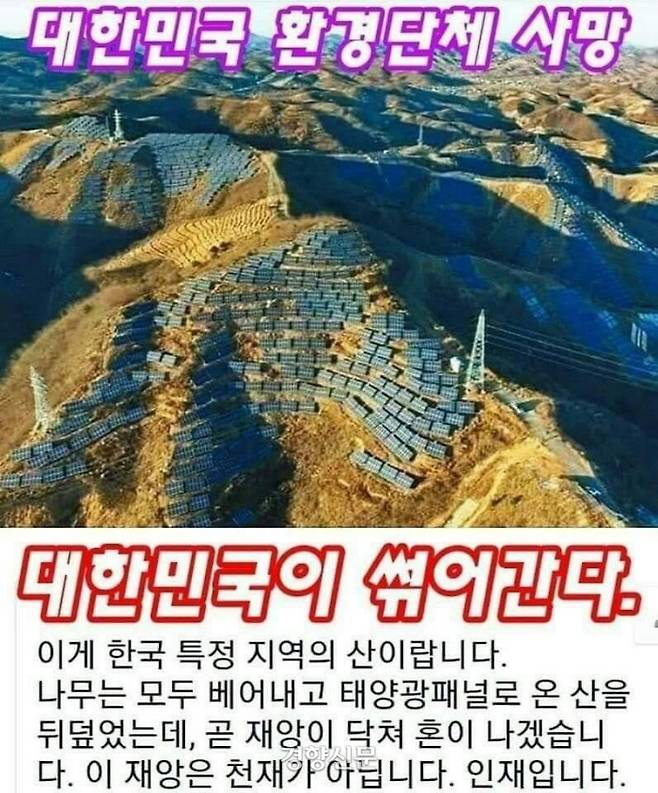 환경단체가 사망했다는 건 이런 ‘자연파괴’를 감시해야 할 환경단체들이 외면하고 있다는 뜻이리라. 주장대로 저 사진은 한국 특정 지역의 산에 설치된 태양광 패널 단지가 맞을까.