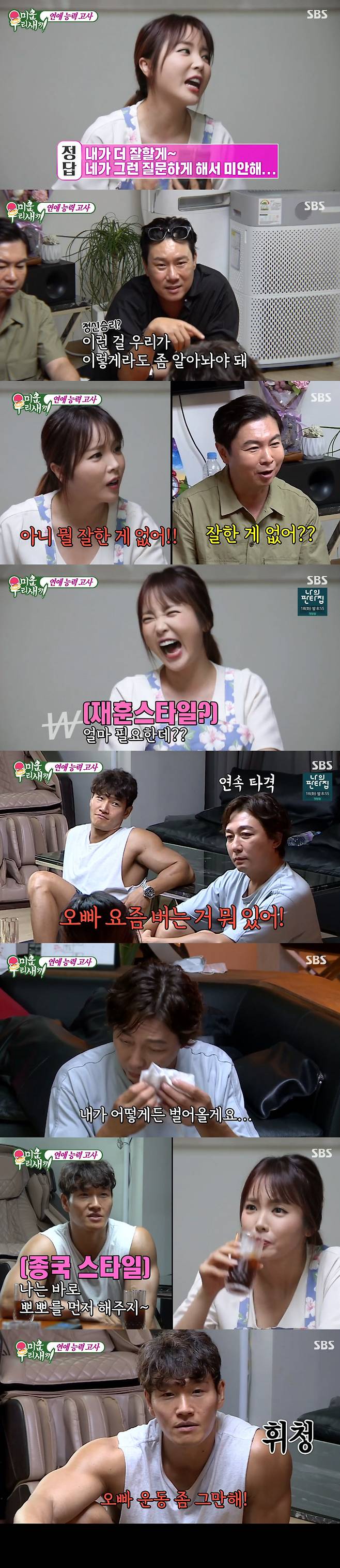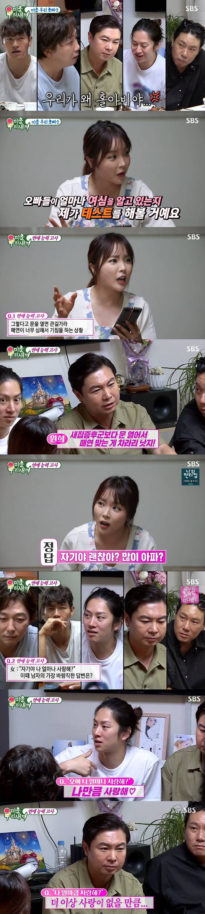 16일 SBS '미운우리새끼'에서는 이상민, 임원희, 김종국, 김희철, 탁재훈을 집으로 초대한 홍진영이 '미우새' 오빠들을 위해 연애 능력 고사 문제를 출제하는 모습이 그려졌다.