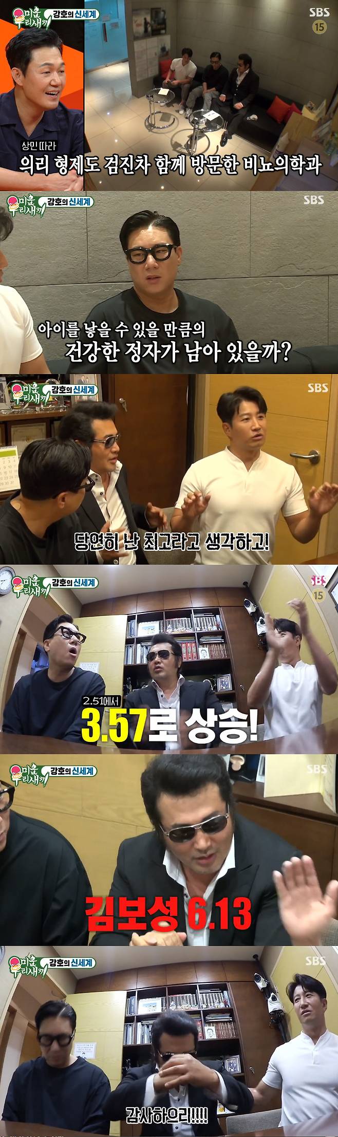 지난 5월, 남성호르면 검사 결과 2.51이었던 이상민은 이날은 3.57로 정상 범위까지 호전이 됐다. 이상민은 "치료를 받으니까 올라간다"며 기쁨을 드러냈다. 이어 이훈은 검사 결과 3.81, 김보성은 6.13이었다. 이에 김보성은 "의리"를 외쳐 웃음을 안겼다.