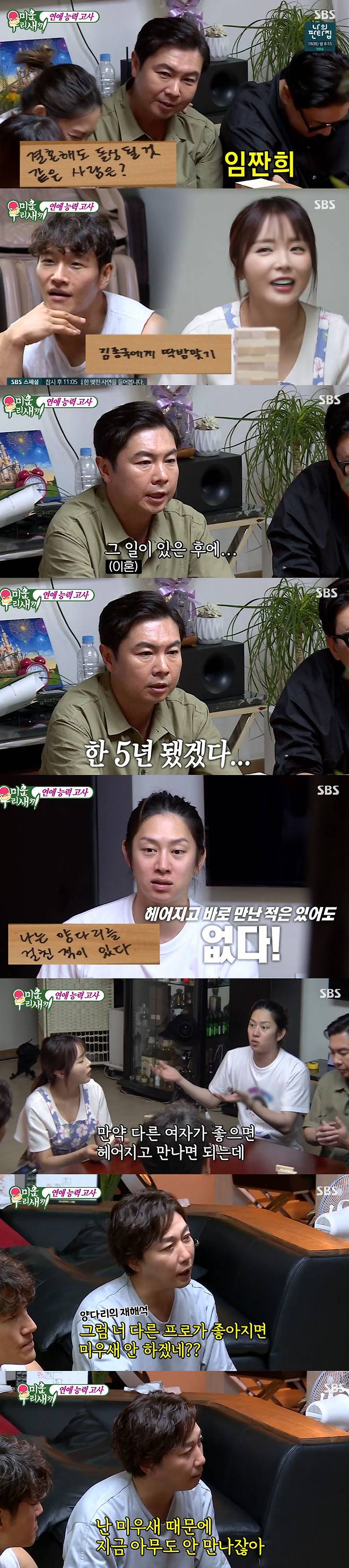 이후 젠가를 뽑아 적힌 질문에 답하는 시간도 가졌다. 김희철은 "결혼해도 돌싱 될 것 같은 사람은?"이라는 질문에 임원희를 지목해 웃음을 안겼다. 이어 임원희는 "마지막 키스는?"이라는 질문에 "그 일이 있는 후에 썸은 아니고 어느 정도 만났던 친구가 있었다. 5년 정도 됐다"고 솔직하게 털어놨다.