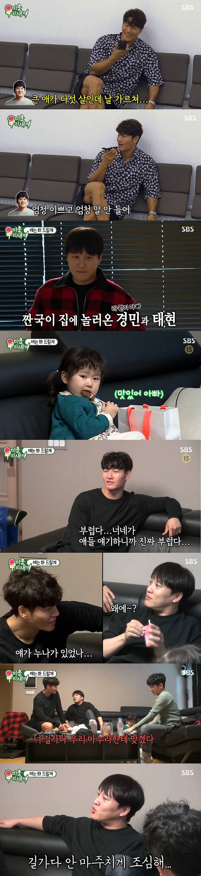김종국은 절친 홍경민에게 전화를 걸었다. 홍경민은 "장난 아니다. 5살인데 날 가르쳐"라면서 "엄청 예쁘고 엄청 말 안들어"라고 했다. 김종국은 "우리 집 왔을 때 엄청 아기더니..."라고 했다.