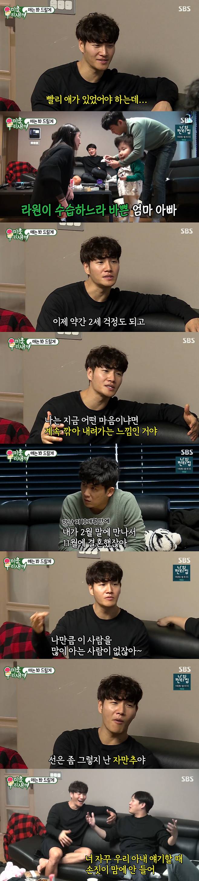 김종국은 '애 보면 결혼 하고 싶은 생각이 드냐'라는 질문에 "작년부터 든다. 2세 걱정도 되고. 아이 때문에 치이고 고생한다 하더라고 그 모습이 건설해가는 모습이다. 나는 계속 깎아 내려가는 것 같다"고 털어놨다