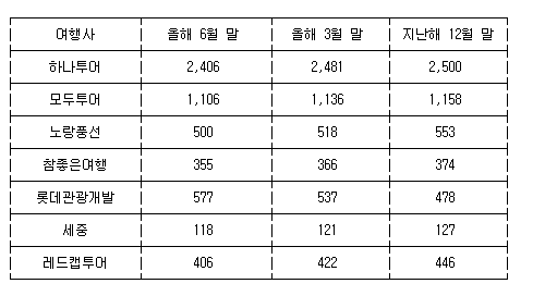 17일 금융감독원 전자공시시스템에 따르면 국내 최대 여행사인 하나투어는 6월 말 현재 직원이 2천406명으로 지난해 말보다 94명 줄었다.