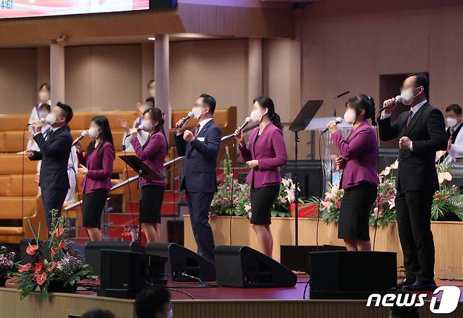 (서울=뉴스1) 신웅수 기자 = 지난 16일 오전 서울 여의도 순복음교회에서 열린 현장 예배에서 성가대가 노래하고 있다.