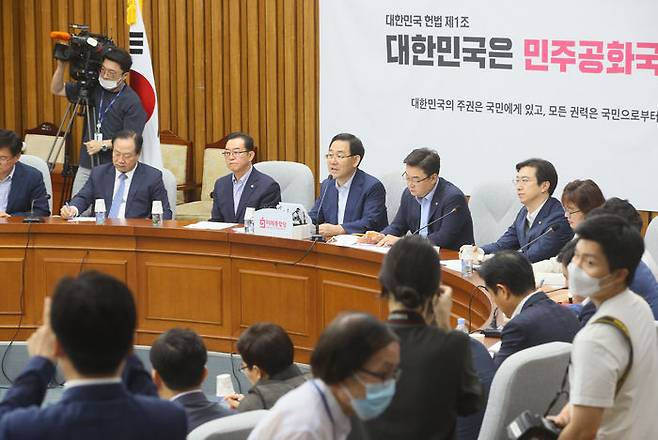 "감당할 수 있겠습니까" 백드롭은 7월 30일에 첫 선을 보였는데요. 이날 부동산 법안을 강행처리한 민주당이 후폭풍을 감당할 수 있겠냐는 의미였다고 하고요.