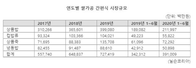CJ제일제당 대표 쌀가공 간편식은 '햇반', '햇반컵반', '비비고 죽', '비비고 냉동밥'이다. 이 제품들의 합산 매출(소비자가 환산 기준)은 2017년 4680억원, 2018년 5810억원, 지난해 7000억원으로 매해 평균 20% 이상 증가했다. 올해도 1∼7월 누계 매출 4430억원으로 상승세를 이어가고 있어, 올해 8000억원 이상 매출이 예상된다는 관측이다.